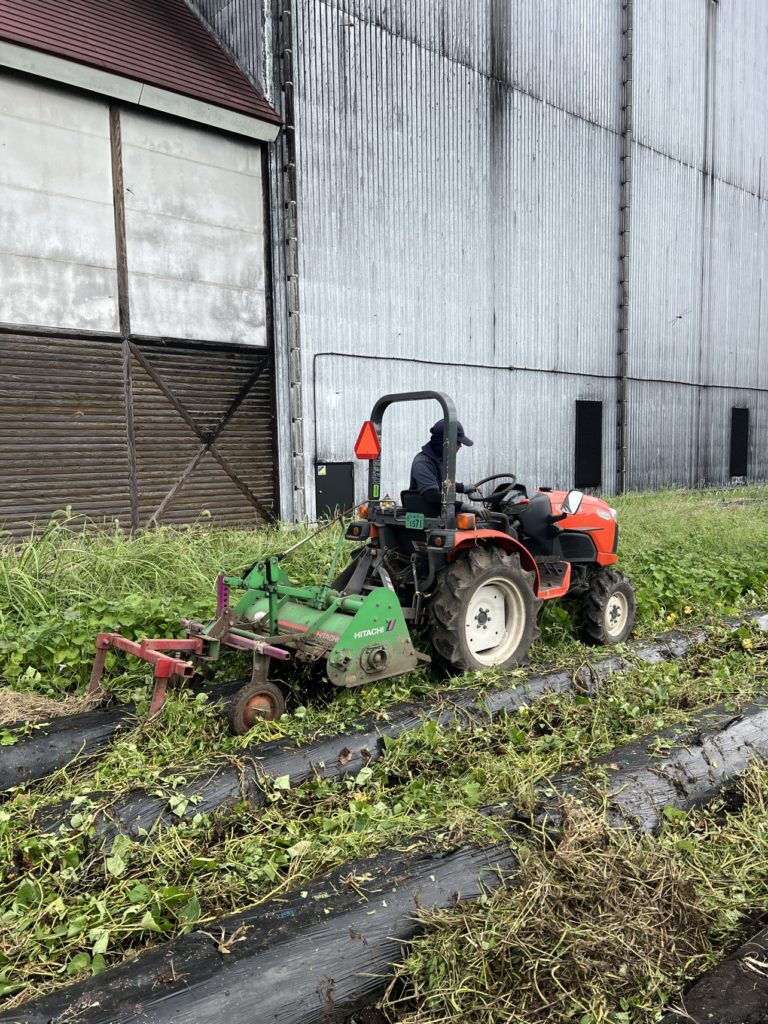 サツマ芋のつるをトラクターで丁寧に切り、
